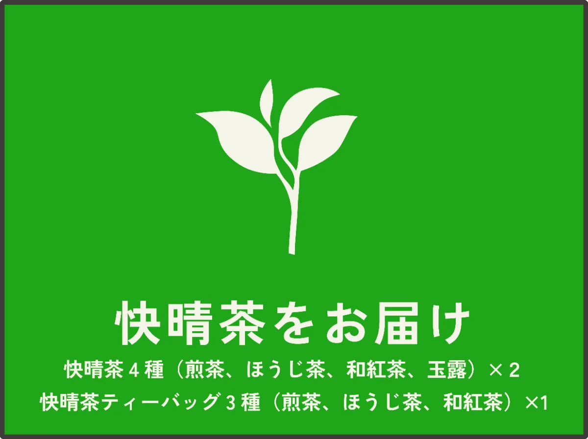 快晴茶セット(煎茶・ほうじ茶・和紅茶・玉露粉末)を2回。快晴茶ティーバッグ(煎茶、ほうじ茶、和紅茶)が届きます。