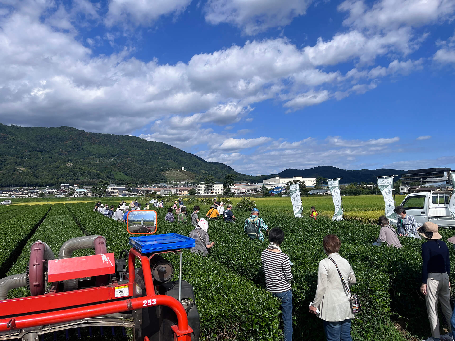 皆さまが茶畑に出向き、無心に茶摘みをし
